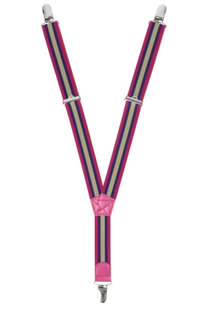 - Szelki dziecięce w paski różowe, niebieskie, żółte i białe z różowym wykończeniem